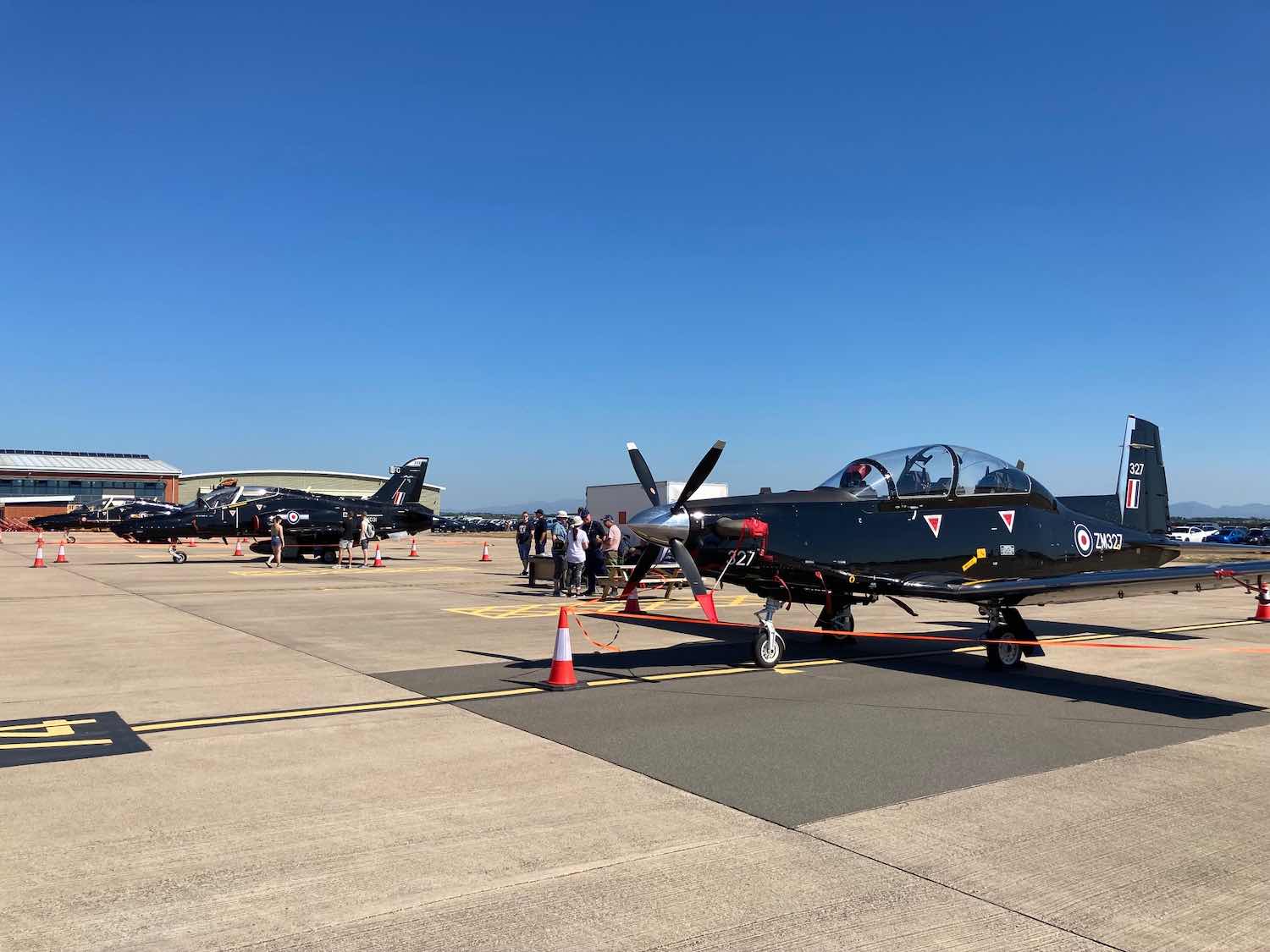 On arrival we were met by Flt Lt Luke Bowman who, with his team of helpers welcomed us in. Once all the visiting aircraft had arrived, they were put to bed in the hangar, apart for a couple of larger types that remined outside. With the other invited guests, we had a very interesting mix of aircraft that formed part of the static display. Once installed in the mess we were able to enjoy a pleasant social evening and it was great to catch up with some of the students and instructors who hosted us on our visit in May. The following morning, we were briefed for the event, then arrange the static display aircraft on three outward facing circles that looked great and worked really well with the visitors. It was a very hot day but our every need was catered for including sun cream as well as the usual food and drink. The afternoon saw the air display that opened with the RAF Falcons and closed with the Red Arrows. In between with the sky was filled with a variety of displays including a very spirited solo display from the Irish Air force in a Pilatus PC9 turboprop aircraft. There was a barbeque in the mess on Thursday evening and another chance to mingle and chat staff, students, and other pilots and guests. Prior to departure on Friday morning, we were given a comprehensive briefing before flying home in conditions that were as close to prefect as they’ll ever be. Huge thanks to Wg Cdr Christ Pote, Flt Lt Luke Bowman and the rest of the team that made our visit another very memorable occasion.